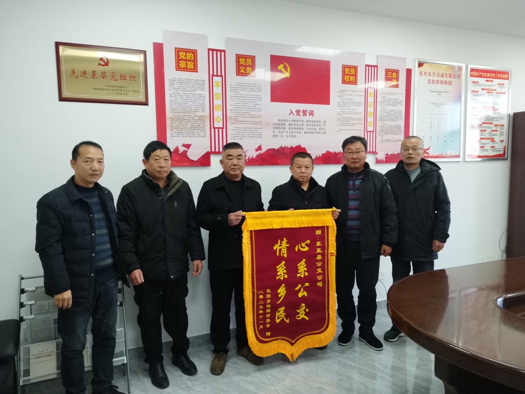 2025年11月25日上午,安徽省池州市東至縣花園鄉桃源村委會支書一行專程來到東至公共交通有限公司,將印有“心系公交 情系鄉民”的錦旗送給公司。感謝公司多年來開行的縣城-桃源村公交車,大大方便了桃源與外界互聯互通,也為沿線人民群眾的出行提供了便利。